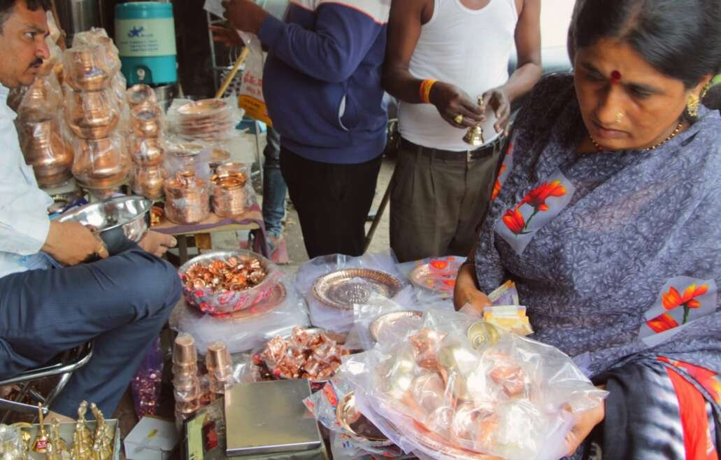 सोलापूर शहरात मधला मारुती चौक परिसरात अधिक मास निमित्त तांब्याच्या पुजा साहित्य खरेदी लगबग दिसुन आली. (छायाचित्र केवल तिवारी)