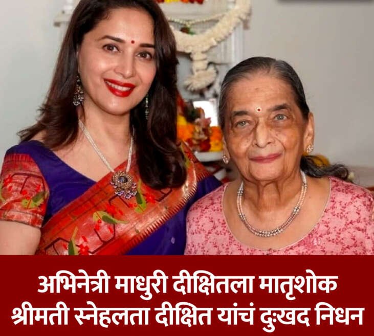 अभिनेत्री माधुरी दीक्षित-नेने यांच्या आई स्नेहलता दीक्षित यांचे आज सकाळी निधन झालं, याची माहिती माधुरी दीक्षितचे नातेवाईक रिक्कू राकेश नाथ यांनी दिली. स्नेहलता दीक्षित यांचं वृद्धापकाळाने निधन झालं आहे. त्यानंतर माधुरी दीक्षितनं ही दु:खद बातमी शेअर केली आहे. माधुरीने सोशल मीडियावर पोस्टमध्ये लिहीलं आहे, माझी प्रिय आई स्नेहलता दीक्षित यांचं आज सकाळी निधन झालंय. त्यांच्या पार्थिवावर आज मुंबई येथे अंत्यसंस्कार होणार आहेत.