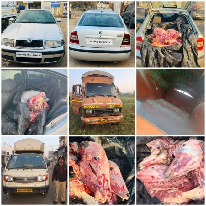 आज दि. 20/01/2023 रोजी पहाटे 6 वा. इंदापूरमध्ये गायी व बैलांची कत्तल करून ते गोमांस एका स्कोडा कार क्र. MH12 DY 4357 मध्ये घेऊन जाणार असल्याची माहिती मानद पशुकल्याण अधिकारी शिवशंकर स्वामी यांना मिळाली…शिवशंकर स्वामींनी सदर गाडी भिगवण येथे स्थानिक पोलिसांच्या मदतीने ताब्यात घेतली…त्यावेळी भिगवण पोलिसांसमोर त्या स्कोडा गाडीच्या चालकाने हे गोमांस इंदापूरमध्ये गायी व बैल कापून पुण्यात घेऊन चाललो आहे असे कबुल केले व इंदापूरमध्ये आत्ताही कत्तल चालू असल्याचे सांगितले. त्यावेळी स्वामींनी ही माहिती वरीष्ठ पोलिस अधिकार्यांना सांगताच वरीष्ठ अधिकार्यांनी इंदापूर कसाई मोहल्ल्यात पोलिस पथके रवाना केली…पोलिस येत असल्याची चाहूल लागताच कसायानी गोमांसाची पळवापळव चालू केली…तरीही पोलिसांना गोमांसाने गच्च भरलेले दोन टेम्पो टाटा 407 क्र. MH16 Q 7393 व अशोक लेलॅण्ड क्र. MH12 SX 7375 मिळून आले…पोलिसांनी संबधित इसमांना ताब्यात घेत सर्व गोमांस व वाहने जप्त केली व संबधित इसमांवर महाराष्ट्र प्राणी संरक्षण कायद्याअंतर्गत गुन्हा दाखल केला आहे..!