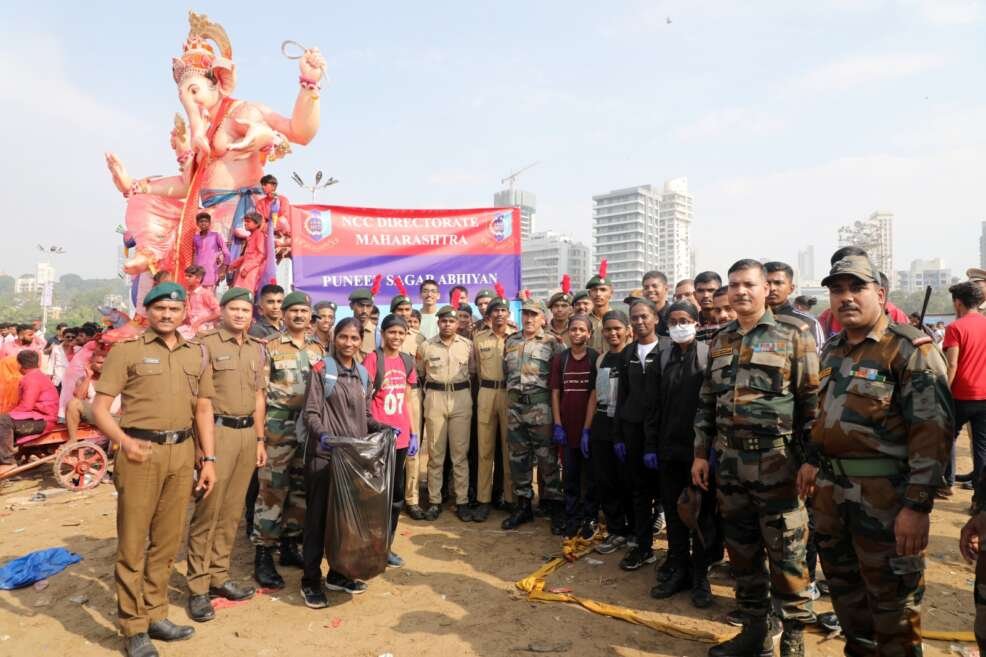 गेले १० दिवस गणेशोत्सवाचा उत्साह पाहायला मिळाला. तर अनंत चतुर्दशीच्या निमित्ताने मुंबईतील प्रमुख चौपाटींवर भक्तांची असंख्य गर्दी पाहायला मिळाली. काही ठिकाणी कालपासून सुरू झालेल्या गणेश विसर्जनाच्या मिरवणुका दुसऱ्या दिवसापर्यंत सुरू होत्या. अशात चौपाटीवर निर्माल्य आणि इतर कचऱ्याचा प्रश्न दर वर्षी निर्माण होतो. त्यामुळे गणपती विर्सजन झाल्यानंतर गिरगाव चौपाटी येथे जमा होणाऱ्या निर्माल्याची व इतर कचऱ्याची स्वच्छता एनसीसी अधिकारी आणि विद्यार्थी यांच्या उपस्थितीत करण्यात आली.