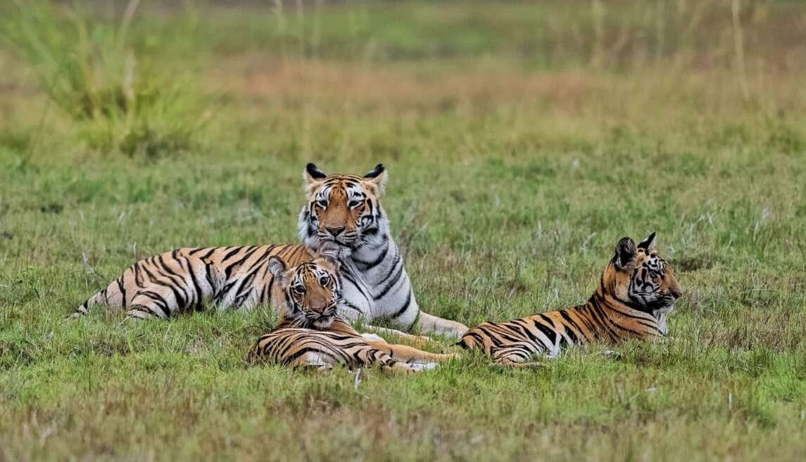 गर्द झाडीत वाघीण आणि बछड्यांचा लडिवाळपणा