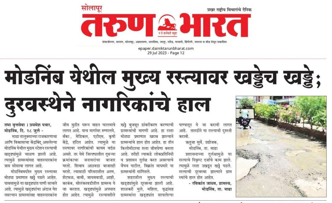 मोडनिंब (ता. माढा) येथील मुख्य रस्त्यावरील खड्ड्याबाबत तरुण भारत ने वृत्त प्रसिद्ध केले होते. त्या वृत्ताची दखल घेत प्रशासनाने तात्पुरती डागडुजी करण्यास सुरूवात करण्यात आली आहे. खडीच्या साहाय्याने खड्डे भरून घेण्यात येत आहेत. सध्या मोडनिंब मध्ये प्रवेश करण्यासाठी असलेल्या या मुख्य रस्त्यावर कायम वर्दळ असते. अपघाताना तोंड देत वाहन धारकांना खड्यातुन मार्ग काढत प्रवास करावा लागतो.परिणामी या खड्ड्यामुळे अनेकांना शारिरीक व्याधी निर्माण झाले आहेत. याच प्रमुख मार्गावर रुग्णालये, बँक, मेडिकल, एटीएम, कृषी विषयक दुकाने, हॉटेल आदी असल्याने नागरिकांची कायम वर्दळ असते.त्यामुळे वाहन धारकांना हाल सोसावे लागत आहेत. परिणामी या खड्यांमुळे अनेकांना शारीरिक व्याधी निर्माण झाल्या आहेत.जिल्ह्यातील क्रमांक दोनचा जनावरांचा बाजार व आठवडा बाजार मोडनिंब येथे भरतो.तसेच दळण वळणा साठी नजिकची अरण, शेटफळ, बावी, जाधववाडी, आष्टी, करकंब, सोलंकरवडी येथून लोकांची वर्दळ दररोज असते.आता मुख्य रस्त्याची तात्पुरती मलमपट्टी करून मोडनिंब करांच्या दुखण्यावर फुंकर मारल्याने मोडनिंबकर काही अशी सुखावला आहे.