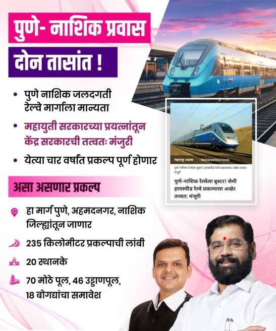 नाशिक – पुणे-नाशिक जलदगती रेल्वे प्रकल्पाला प्रदीर्घ प्रतिक्षेनंतर अखेर केंद्र शासनाची अंतिम मंजुरी मिळाली आहे. उपमुख्यमंत्री देवेंद्र फडणवीस आणि रेल्वेमंत्री अश्विनी वैष्णव यांच्यात बैठक झाली. वैष्णव यांनी पुणे-नाशिक जलदगती रेल्वे प्रकल्पाला मान्यता दिली आहे.
