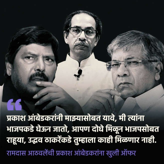 प्रकाश आंबेडकरांनी माझ्यासोबत यावे, मी त्यांना भाजपकडे घेऊन जातो, आपण दोघे मिळून भाजपसोबत राहूया, उद्धव ठाकरेंकडे तुम्हाला काही मिळणार नाही…असे अवाहन रिपाईचे अध्यक्ष रामदास आठवले यांनी प्रकाश आंबेडकर यांना केलं आहे. शिर्डी येथे रिपब्लिकन पार्टी ऑफ इंडियाचे राज्यस्तरीय अधिवेशन पार पडले. यावेळी कार्यकर्त्यांना संबोधित करताना आठवले यांनी हे आवाहन केलं आहे.