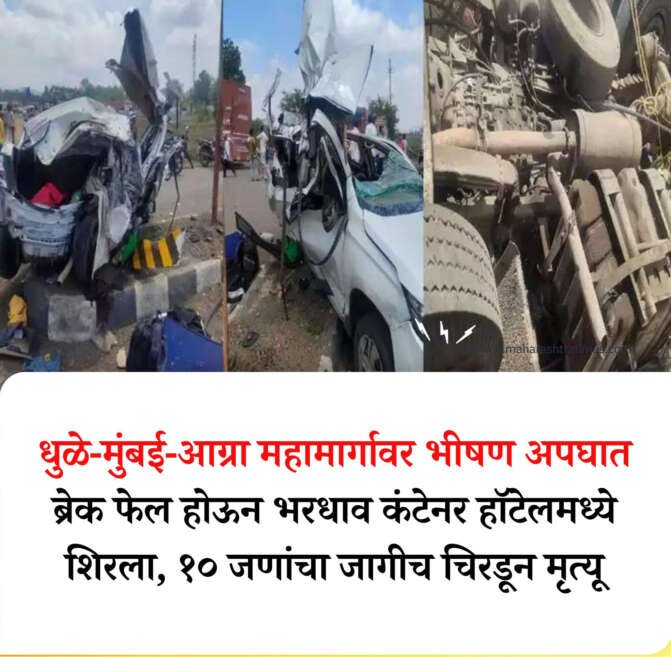 दोन दिवसांपूर्वी बुलढाणा जिल्ह्यातील सिंदखेडराजा जवळ समृद्धी महामार्गावर एका खासगी बसचा भीषण अपघात होऊन २६ जणांचा मृत्यू झाल्याच्या घटनेनं संपूर्ण महाराष्ट्र हादरला. या अपघाताची घटना ताजी असतानाच आता धुळे-मुंबई-आग्रा महामार्गावर शिरपूर तालुक्यातील पळासनेर गावाजवळ भीषण अपघात झाला आहे. ब्रेक फेल झाल्याने भरधाव कंटेनर हॉटेलमध्ये शिरल्याने हा अपघात झाला आहे. या भीषण अपघातात १० जणांचा जागीच मृत्यू झाला आहे, तर मृतांची संख्या वाढण्याची भीती वर्तवण्यात येत आहे. या अपघातात १५ ते २० जण जखमी झाले आहेत.