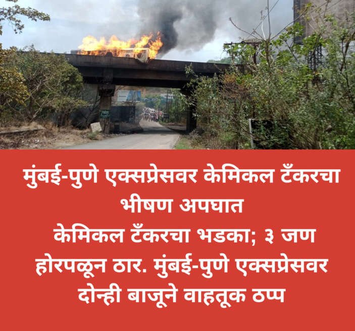 यामध्ये दुचाकीवरील १२ वर्षांचा मुलगा होरपळून ठार झाला तर त्याचे आई-वडील गंभीर जखमी झाले आहेत. या दुर्घटनेनंतर पुण्याकडून मुंबईकडे जाणारी वाहतूक ठप्प झाली आहे. तर दुर्घटनेत टँकर चालकही गंभीर जखमी झाला असल्याची माहिती आहे. या घटनेचे फोटोही सध्या समोर आले आहेत. तर पोलीस आणि मदतकार्य घटनास्थळी दाखल झाल्याची माहिती आहे. प्राथमिक माहितीनुसार, या अपघातामध्ये आतापर्यंंत एकूण ३ ठार आणि ३ गंभीर जखमी असल्याची माहिती आहे.