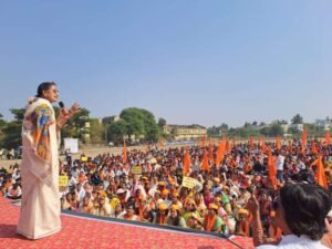 राज्यासह देशात धर्मांतरण कायदा आणावा लव जिहाद विरोधी सरकारने कडक पावले उचलावीत यासाठी परळी येथे आज सकल हिंदू समाजाचा विराट मोर्चा काढण्यात आला. या मोर्चासाठी एक महिन्यापासून तयारी सुरू होती सकाळी नऊ वाजल्यापासून शहरातील राणी लक्ष्मीबाई चौकात हिंदू बांधव जमायला सुरुवात झाले मोर्चाला पाठिंबा म्हणून परळीतील व्यापाऱ्यांनी आपले व्यवसाय कडेकोट बंद ठेवत या महामोर्चामध्ये आपला सहभाग नोंदवला. सकाळी दहाच्या दरम्यान निघालेला विराट हिंदू मोर्चा राणी लक्ष्मीबाई टावर – बाजार समिती – अग्रवाल लॉज – स्टेशन रोड – छत्रपती शिवाजी महाराज चौक – जलालपूर रोड – विद्यानगर परिसर मार्गे तहसील परिसरात मोर्चा धडकला.