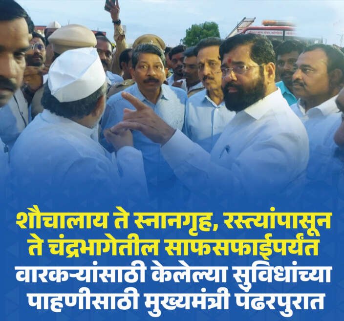 वारकऱ्यांसाठी केलेल्या सुविधांची पाहणी करण्यासाठी मुख्यमंत्री एकनाथ शिंदे पंढरपुरात दाखल झाले आहेत.आषाढी यात्रेपुर्वी पंढरपूर येथे एकनाथ शिंदे यांनी पहाणी केली. शहरातील दर्शरांग, वाखरी पालखीतळ आदी ठिकाणी जाऊन प्रशासनाने केलेल्या सोयी सुविधेची माहिती घेतली तसेच योग्य त्या सूचना दिल्या. शिंदेंनी रस्त्यांपासून ते चंद्रभागेतील साफसफाईपर्यंत सगळी चौकशी केली. तसेच शौचालय, स्नानगृह, पिण्याचं पाणी,महिलांसाठी चेंजींग रुम, अशा सगळ्या गोष्टींची शिंदेंकडून चौकशी करण्यात आली.