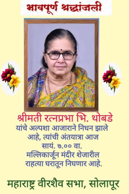 श्रीमती रत्नप्रभा भि. थोबडे यांचे अल्पशा आजाराने निधन झाले आहे. त्यांची अंत्ययात्रा आज दि २० ससप्टेंबर रोजी सायंकाळी ७ वाजता मल्लिकार्जुन मंदिर शेजारील राहत्या घरातून निघणार आहे