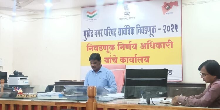 मुखेड / नांदेड – निवडनुक आयोगाने नुकतेच जाहिर केलेल्या नगर परिषद निवडनुकिचे बिगुल जाहिर होताच मुखेड नगरपरिषद सार्वत्रिक निवडणुकी साठी शासकिय यंञना सज्ज झाली असुन २७ मतदान केंद्रावर मतदान होणार असुन दि. २ डिसेंबर २५ रोजी मतदान तर बुधवार ३ डिसेंबरला तहसील कार्यालयात मतमोजणी होणार असुन या निवडणुकीसाठी २६ हजार ६५६ मतदार मतदानाचा हक्क बजावनार आहेत.या नप सार्वत्रिक निवडणूकीचा कार्यक्रम ४ नोव्हेंबर पासुन राज्य निवडणूक आयोगाने जाहीर केला असून नगरपरिषद कार्यक्षेत्रात मंगळवार पासून आचारसंहिता लागू झाली आहे.