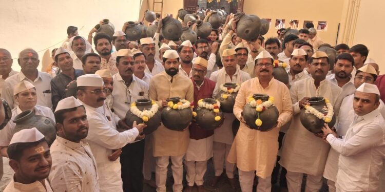 सोलापूर : सिद्धेश्वर महाराजांच्या अक्षता सोहळ्यानिमित्त शनिवारी कसब्यातील कुंभार कन्येच्या माहेरांकडून ५६ मातीच्या घागरी यात्रेचे प्रमुख मानकरी राजशेखर हिरेहब्बू यांच्याकडे सुपूर्द केल्या. यात कुंभार समाजातील महिलांसह भाविक मोठ्या प्रमाणात सहभागी झाले होते.
