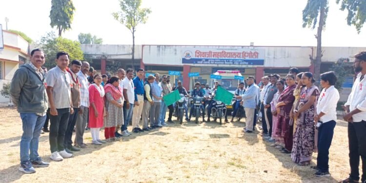हिंगोली – जिल्हा एड्स प्रतिबंध व नियंत्रण विभाग जिल्हा रुग्णालय हिंगोली व शिवाजी महाविद्यालय हिंगोली यांच्या संयुक्त विद्यमाने आज दिनांक 01/12/2025 रोजी जागतिक एड्स दिनानिमित्त भव्य अशी मोटारसायकल रॅली काढण्यात आली. शिवाजी महाविद्यालय हिंगोली येथून सदरील मोटारसायकल रॅलीला जिल्हा शल्य चिकित्सक डॉ नितीन तडस यांनी हिरवी झेंडी दाखवून सुरुवात केली.