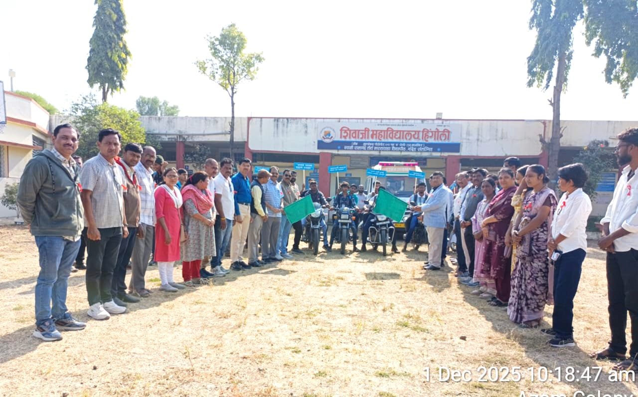 हिंगोली – जिल्हा एड्स प्रतिबंध व नियंत्रण विभाग जिल्हा रुग्णालय हिंगोली व शिवाजी महाविद्यालय हिंगोली यांच्या संयुक्त विद्यमाने आज दिनांक 01/12/2025 रोजी जागतिक एड्स दिनानिमित्त भव्य अशी मोटारसायकल रॅली काढण्यात आली. शिवाजी महाविद्यालय हिंगोली येथून सदरील मोटारसायकल रॅलीला जिल्हा शल्य चिकित्सक डॉ नितीन तडस यांनी हिरवी झेंडी दाखवून सुरुवात केली.