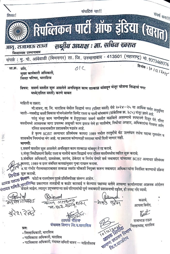 धाराशिव – मौजे धारूर येथील सिद्धार्थ नगर (दलित वस्ती) मध्ये २०२४–२५ या आर्थिक वर्षात अनुसूचित जाती–नवबौद्ध वस्ती विकास योजनेअंतर्गत मंजूर असलेले सिमेंट रस्ता व नाली बांधकाम (सांकेतिक क्र. ३८५) हे काम अनधिकृतरीत्या सवर्ण वस्तीत वळवून सुरू केल्याचा गंभीर प्रकार समोर आला आहे.