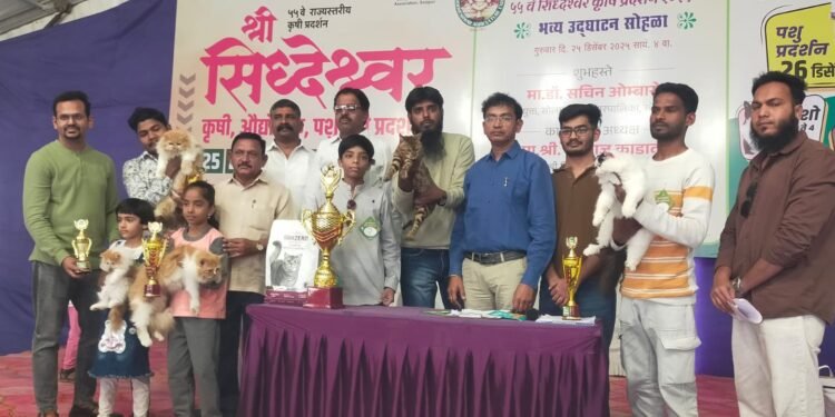 ग्रामदैवत शिवयोगी सिध्दरामेश्वर यात्रे निमित्त श्री सिध्देश्वर देवस्थानच्यावतीने होम मैदान येथे 25 डिसेंबर पासून सुरू असलेल्या श्री सिध्देश्वर कृषीव औद्योगिक प्रदर्शनात रविवारी आयोजित कॅट शोने सर्वांची मने जिंकली.प्रदर्शनातील चौथा दिवस रविवार असल्याने नागरीकांनी प्रदर्शन पाहण्यासाठी गर्दी केली होती. मुख्य सभा मंडपात सकाळी 10 ते दुपारी 4 पर्यंत चाललेल्या कॅट शोमध्ये सुमारे 70 मांजरांनी सहभाग नोंदविला. यावेळी फॅन्सी – फॅशन कॅट शो या स्पर्धाही घेण्यात आल्या. या फॅशन शोमध्ये कॅटच्या मालकांच्या कल्पकतेची अनोखी झलक पाहण्यास मिळाली. उपस्थितांनी फॅशन शोला मोठा प्रतिसाद दिला.सर्वच वयोगटातील स्त्री पुरूषांनी उत्साहात या स्पर्धेत सहभाग घेतल्याचे दिसून आले. कॅट शोमधील विजेत्यांना कृषी प्रदर्शन समितीचे अध्यक्ष गुरूराज माळगे, विश्वस्त पशुपतीनाथ माशाळ यांच्या हस्ते पुरस्कार देऊन गौरविण्यात आले.
