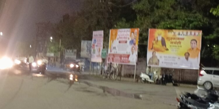 फोटो ओळ – सोलापूर शहरातील गुरुनानक चौक आणि अंत्रोळीकर नगर परिसरात लावलेले बॅनर दिसत आहेत.