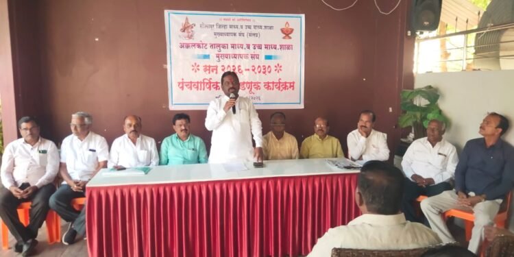 अक्कलकोट – सोलापूर जिल्हा माध्यमिक व उच्च माध्यमिक शाळा मुख्याध्यापक संघ सोलापूर 2026 ते 2030 पंचवार्षिक निवडणूक कार्यक्रम अंतर्गत अक्कलकोट तालुका माध्यमिक व उच्च माध्यमिक मुख्याध्यापक संघ यांची सभा अक्कलकोट येतील अजिंक्यराणा फंक्शन हॉल येथे संपन्न होऊन, नूतन तालुका कार्यकारणी व तालुक्यातील एक जिल्हा प्रतिनिधी यांच्या निवडी जाहीर करण्यात आले.