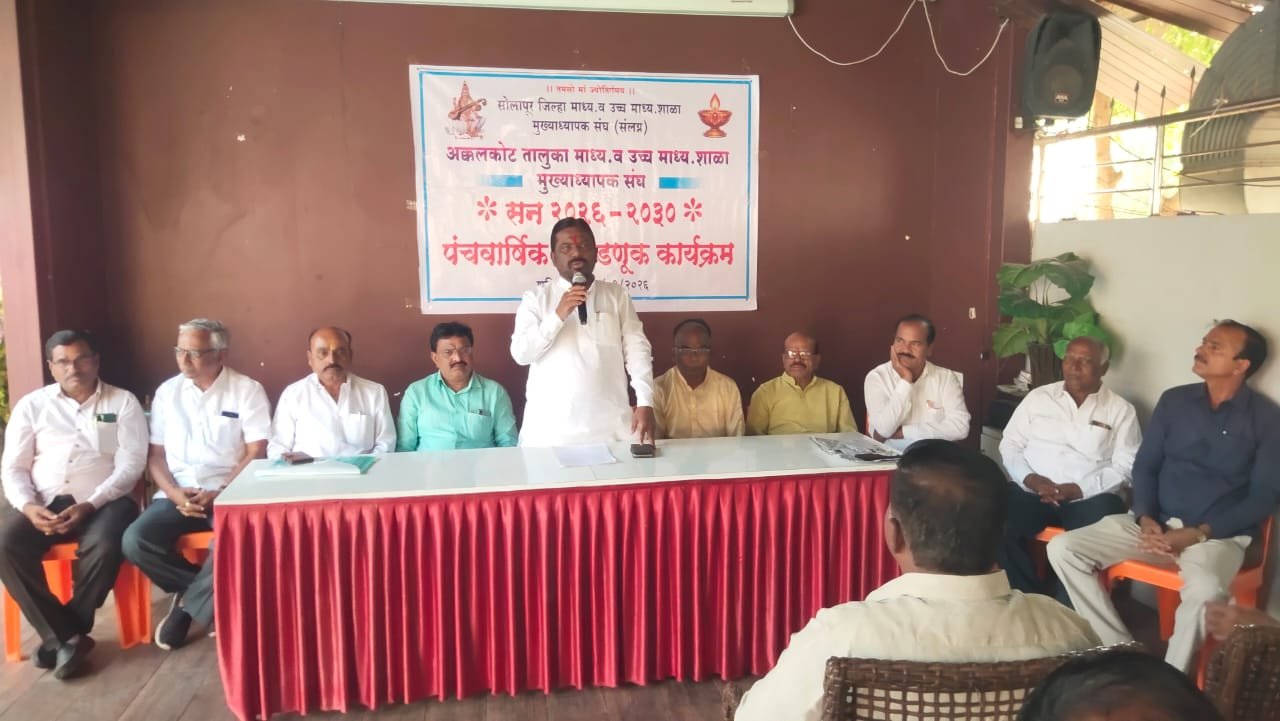 अक्कलकोट – सोलापूर जिल्हा माध्यमिक व उच्च माध्यमिक शाळा मुख्याध्यापक संघ सोलापूर 2026 ते 2030 पंचवार्षिक निवडणूक कार्यक्रम अंतर्गत अक्कलकोट तालुका माध्यमिक व उच्च माध्यमिक मुख्याध्यापक संघ यांची सभा अक्कलकोट येतील अजिंक्यराणा फंक्शन हॉल येथे संपन्न होऊन, नूतन तालुका कार्यकारणी व तालुक्यातील एक जिल्हा प्रतिनिधी यांच्या निवडी जाहीर करण्यात आले.