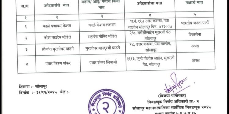 प्रभाग क्रमांक ७-ड (सर्वसाधारण) येथून अमोल शिंदे यांनी उमेदवारी अर्ज दाखल केला असून छाननी प्रक्रियेत त्यांचा अर्ज वैध ठरला होता. मात्र, निवडणूक निर्णय अधिकारी कार्यालयाकडून जाहीर करण्यात आलेल्या सद्यस्थितीतील उमेदवारांच्या यादीत त्यांच्या नावाऐवजी अन्य उमेदवाराचे नाव असल्याचे आढळून आले. त्यामुळे निवडणूक कार्यालयात गोंधळाचे वातावरण निर्माण झाले. हा प्रकार लक्षात येताच शिवसेना शिंदे गटाच्या कार्यकर्त्यांनी तीव्र नाराजी व्यक्त केली. परिस्थिती तणावपूर्ण झाल्याने पोलीस बंदोबस्तही तातडीने तैनात करण्यात आला. दरम्यान, अमोल शिंदे यांच्या मदतीला काँग्रेस शहराध्यक्ष चेतन नरोटे, राष्ट्रवादी काँग्रेस अजित पवार गटाचे शहराध्यक्ष संतोष पवार यांच्यासह विरोधी पक्षातील पदाधिकारीही धावून आले.