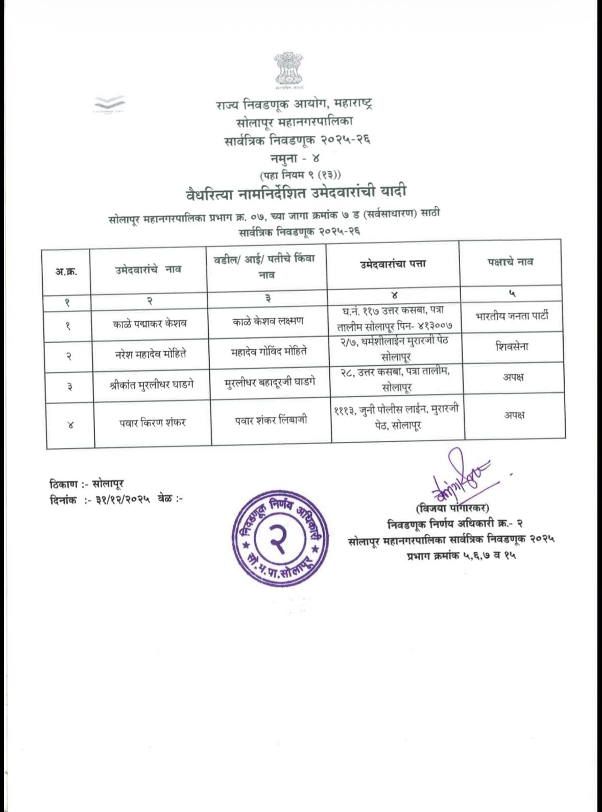 प्रभाग क्रमांक ७-ड (सर्वसाधारण) येथून अमोल शिंदे यांनी उमेदवारी अर्ज दाखल केला असून छाननी प्रक्रियेत त्यांचा अर्ज वैध ठरला होता. मात्र, निवडणूक निर्णय अधिकारी कार्यालयाकडून जाहीर करण्यात आलेल्या सद्यस्थितीतील उमेदवारांच्या यादीत त्यांच्या नावाऐवजी अन्य उमेदवाराचे नाव असल्याचे आढळून आले. त्यामुळे निवडणूक कार्यालयात गोंधळाचे वातावरण निर्माण झाले. हा प्रकार लक्षात येताच शिवसेना शिंदे गटाच्या कार्यकर्त्यांनी तीव्र नाराजी व्यक्त केली. परिस्थिती तणावपूर्ण झाल्याने पोलीस बंदोबस्तही तातडीने तैनात करण्यात आला. दरम्यान, अमोल शिंदे यांच्या मदतीला काँग्रेस शहराध्यक्ष चेतन नरोटे, राष्ट्रवादी काँग्रेस अजित पवार गटाचे शहराध्यक्ष संतोष पवार यांच्यासह विरोधी पक्षातील पदाधिकारीही धावून आले.