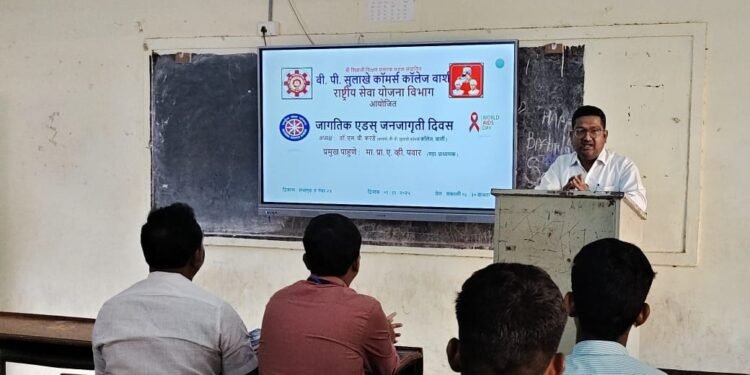 बार्शी – श्री शिवाजी शिक्षण प्रसारक मंडळ संचालित बी.पी. सुलाखे कॉमर्स कॉलेज, बार्शी येथे राष्ट्रीय सेवा योजना (NSS) विभागातर्फे जागतिक एड्स दिनानिमित्त जनजागृती कार्यक्रम प्रेरणादायी वातावरणात पार पडला. कार्यक्रमात युवकांच्या पुढाकारातूनच एड्समुक्त समाज उभारता येऊ शकतो, असा ठाम संदेश प्रमुख पाहुणे व अध्यक्षीय भाषणातून देण्यात आला.