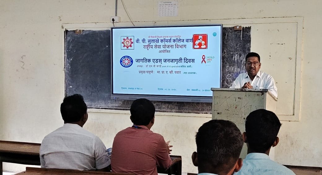 बार्शी – श्री शिवाजी शिक्षण प्रसारक मंडळ संचालित बी.पी. सुलाखे कॉमर्स कॉलेज, बार्शी येथे राष्ट्रीय सेवा योजना (NSS) विभागातर्फे जागतिक एड्स दिनानिमित्त जनजागृती कार्यक्रम प्रेरणादायी वातावरणात पार पडला. कार्यक्रमात युवकांच्या पुढाकारातूनच एड्समुक्त समाज उभारता येऊ शकतो, असा ठाम संदेश प्रमुख पाहुणे व अध्यक्षीय भाषणातून देण्यात आला.