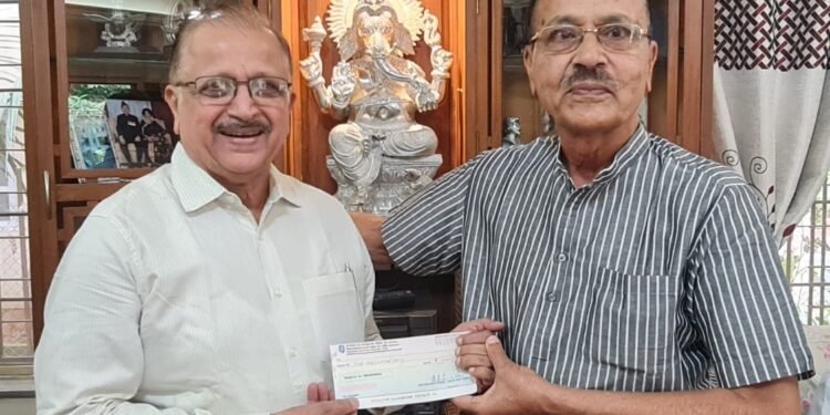एअर कमोडर अरुण इनामदार ( निवृत्त ) यांच्या तर्फे राष्ट्रीय स्वयंसेवक संघाच्या जनकल्याण समितीला अतिवृष्टीग्रस्त नागरिकांच्या मदतीसाठी धनादेश सचिव जनकल्याण समिती प्रमोद गोऱ्हे यांना देतांना.