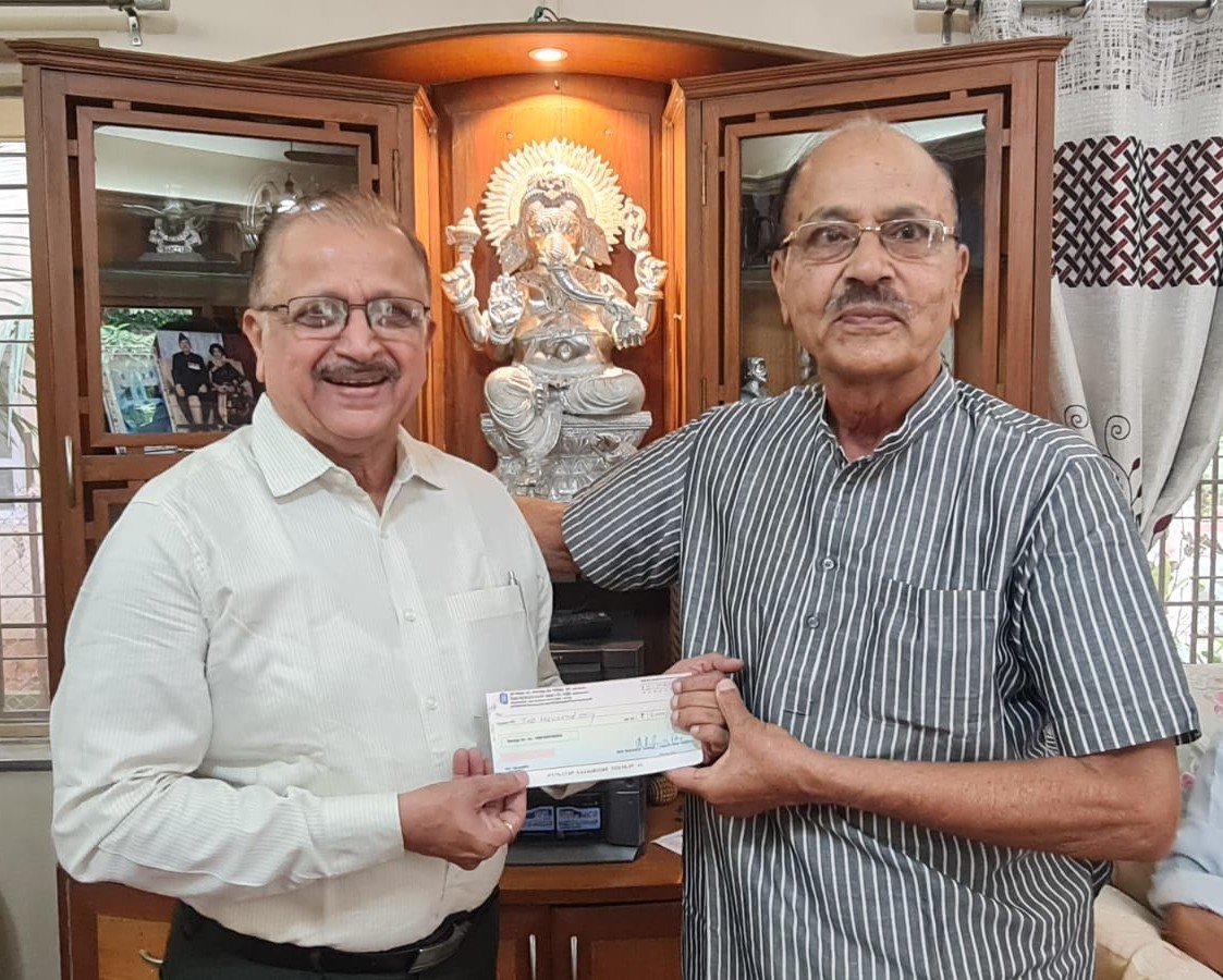 एअर कमोडर अरुण इनामदार ( निवृत्त ) यांच्या तर्फे राष्ट्रीय स्वयंसेवक संघाच्या जनकल्याण समितीला अतिवृष्टीग्रस्त नागरिकांच्या मदतीसाठी धनादेश सचिव जनकल्याण समिती प्रमोद गोऱ्हे यांना देतांना.