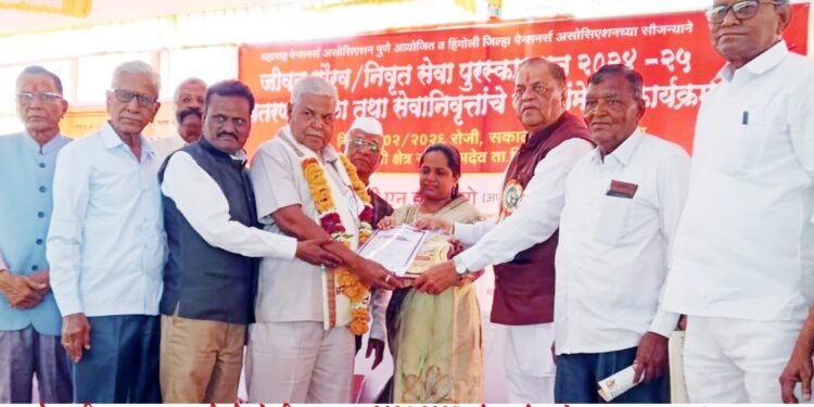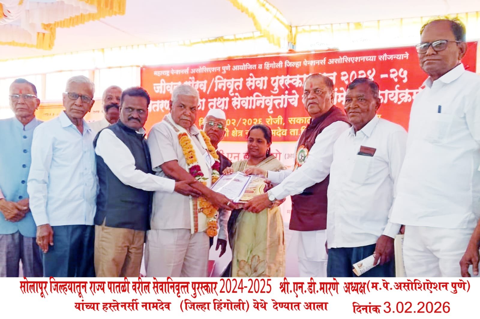 बार्शी – महाराष्ट्र पेन्शनर असोसिएशन पुणे यांच्यातर्फ उत्तम दत्तात्रय पोतदार यांना निवृत्त सेवा पुरस्कार दि. ३ फेब्रुवारी रोजी श्रीक्षेत्र नर्सी नामदेव जिल्हा हिंगोली येथे सोलापूर जिल्हातून राज्य पातळीवरील सेवानिवृत्त पुरस्कार २०२४-२०२५ श्री. एन.डी. मारणे (अध्यक्ष महाराष्ट्र पेन्शनर असोशिऐशन पुणे ) यांच्या हस्ते सन्मानपत्र, ट्राॕफी देऊन गौरविण्यात आले.