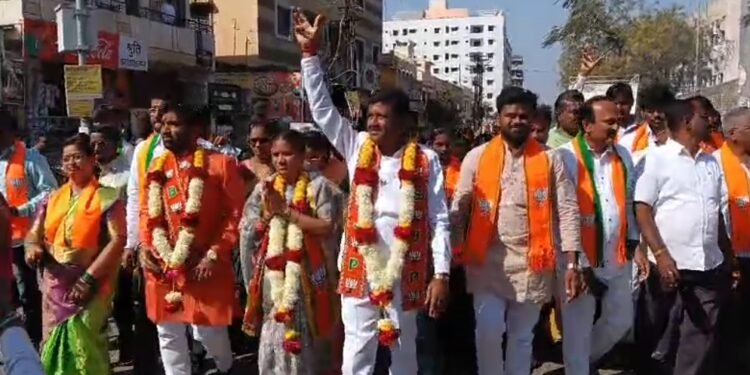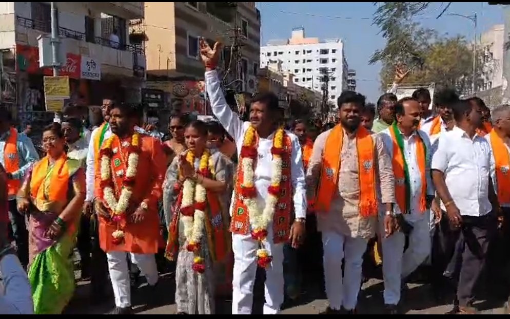 सोलापूर – प्रभाग क्रमांक १३ मध्ये भारतीय जनता पार्टीचे अधिकृत उमेदवार सत्यनारायण गुर्रम, विजय चिप्पा, सुनिता कामठी आणि अंबिका चौगुले यांच्या प्रचारार्थ शुक्रवारी भव्य पदयात्रा काढण्यात आली. पंचमुखी हनुमान मंदिर येथून ढोल-ताशांच्या गजरात पदयात्रेस सुरुवात होऊन सत्यम हॉटेल, गीता नगर, श्रीकृष्ण मंगल कार्यालय, एकता नगर, चिल्ड्रन पार्क, मार्कंडेय वसाहत, महालक्ष्मी मंदिर, क्रांती झोपडपट्टी व श्रीकृष्ण मंदिर परिसरात समारोप झाला. फटाक्यांची आतषबाजी व भगव्या झेंड्यांमुळे संपूर्ण परिसर भगवामय झाला.