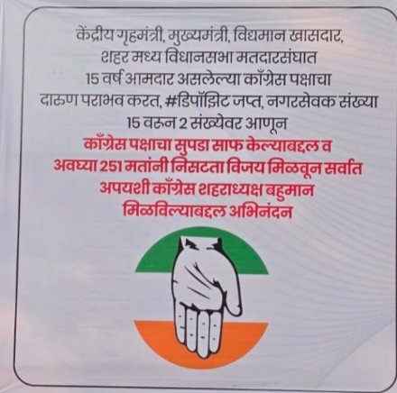 दुसऱ्या डिजिटलमध्ये मात्र काँग्रेस शहराध्यक्षांवर मिश्कील आणि विडंबनात्मक टीका करण्यात आली आहे. या डिजिटलमध्ये काँग्रेसच्या पराभवांचा संदर्भ देत, “केंद्रीय गृहमंत्री, मुख्यमंत्री, विद्यमान खासदार तसेच शहर मध्य विधानसभा मतदारसंघात दीर्घकाळ आमदार असलेल्या काँग्रेस पक्षाचा दारुण पराभव करत, डिपॉझिट जप्त होण्याची वेळ आणून आणि नगरसेवकांची संख्या १५ वरून २ पर्यंत घसरवल्याबद्दल तसेच अवघ्या २५१ मतांनी निसटता विजय मिळवून ‘सर्वात अपयशी काँग्रेस शहराध्यक्ष’ बहुमान मिळवल्याबद्दल अभिनंदन,” असा टोला लगावण्यात आला आहे.