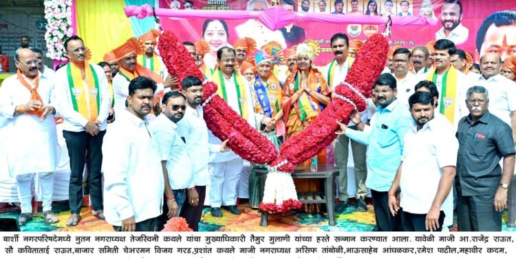 बार्शी – नगरपरिषदेच्या भाजपच्या नूतन नगराध्यक्षा तेजस्विनी कथले यांनी आज जोरदार शक्ती प्रदर्शन करत मिरवणुकीद्वारे वाजत गाजत जाऊन नगरपालिका मुख्यालयात नगराध्यक्ष पदाचा पदभार स्वीकारला.