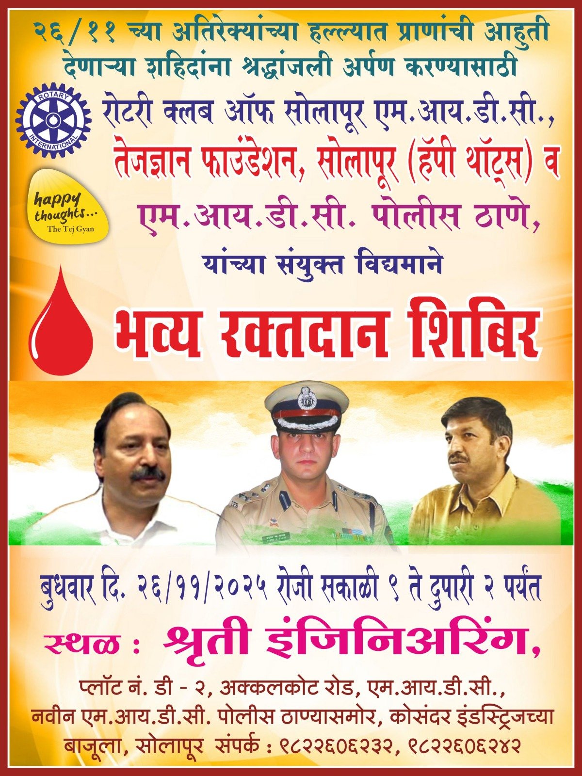 सोलापूर – 26/11 च्या अतिरेक्यांच्या हल्ल्यात प्राणांची आहुती देणाऱ्या शहिदांना श्रध्दांजली अर्पण करण्यासाठी रोटरी क्लब ऑफ सोलापूर एम.आय.डी.सी., तेजज्ञान फाउंडेशन सोलापूर (हॅप्पी थॉट्स) व एम.आय.डी.सी. पोलीस ठाणे यांच्या संयुक्त विघमाने श्रृती इंजिनिअरिंग प्लॉट नं.डी-2 , अक्कलकोट रोड, कोसंदर इंडस्ट्रीजच्या बाजूला, नविन पोलीस ठाणे समोर, बुधवार दि. 26 नोव्हेंबर 2025 रोजी सकाळी 9 ते 2 वाजेपर्यंत भव्य रक्तदान शिबीराचे आयोजन करण्यात आले आहे.