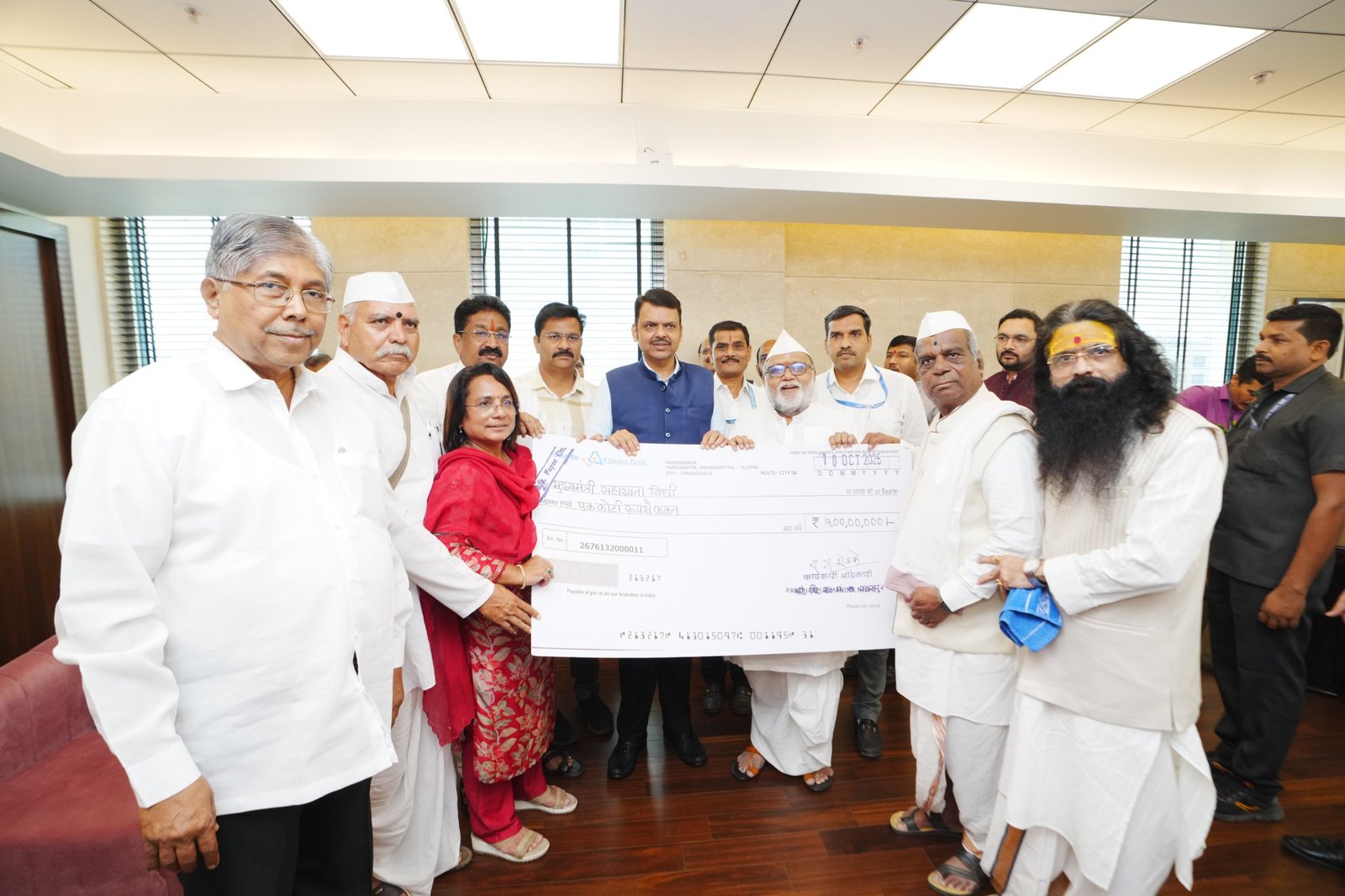 या आवाहनास प्रतिसाद देत तसेच सामाजिक उत्तरदायित्व व मानवतावादी भूमिकेतून श्री विठ्ठल-रुक्मिणी मंदिर समितीने शासनाची मंजुरी घेऊन मुख्यमंत्री सहायता निधीस एक कोटी रुपयाच्या मदतीचा धनादेश दिनांक १४ ऑक्टोबर रोजी मंत्रालय येथे मुख्यमंत्री देवेंद्र फडणवीस यांच्याकडे जमा केल्याची माहिती मंदिर समितीचे सह अध्यक्ष गहिनीनाथ महाराज औसेकर यांनी दिली.