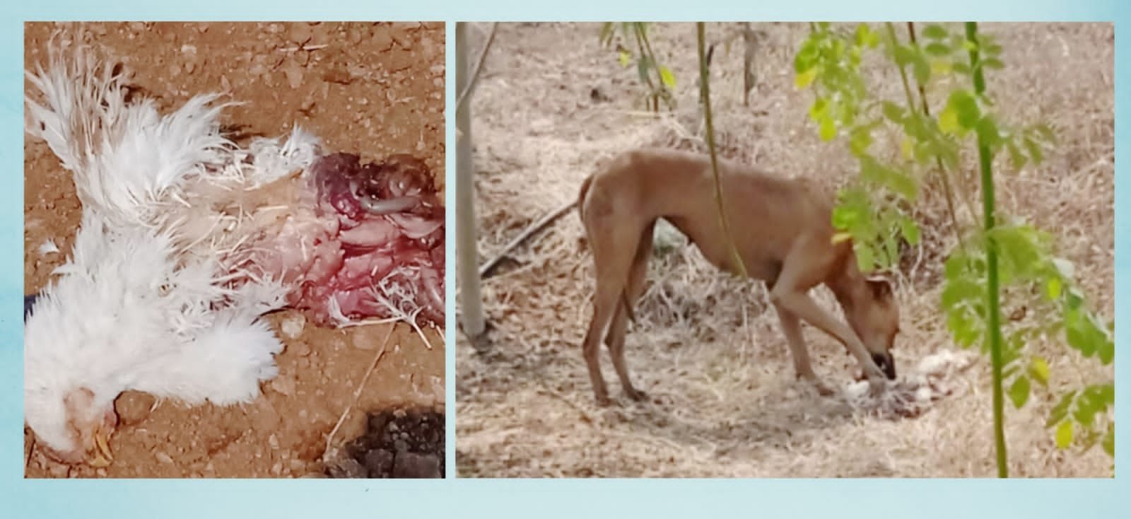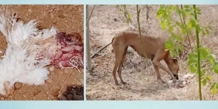 फोटो._ कुसमोड येथील कुक्कुटपालन व्यवसाय करणाऱ्याने फेकुन दिलेल्या कोंबड्या तर दुसऱ्या फोटोत गोळा झालेली कुञी