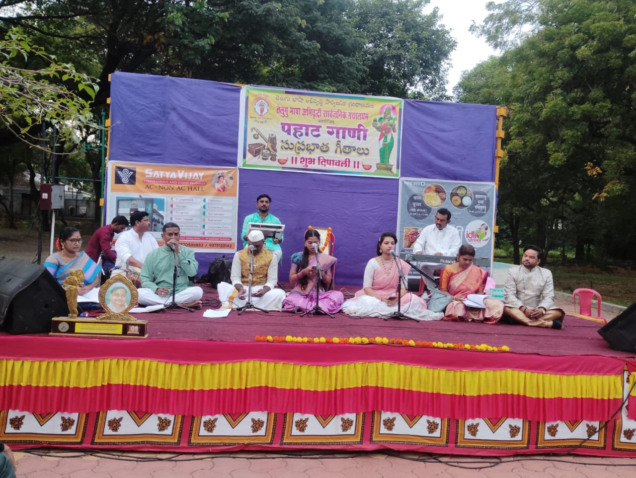 ग्रंथालयाच्या पदाधिकारी व सदस्यांच्या हस्ते तेलुगु तल्ली प्रतिमेचे पूजन व द्वीप प्रज्वलन करण्यात आले.ऑर्केस्ट्रा स्टार्स ऑफ मेलोडीज जब्बार मुर्शद प्रस्तुत कु. भव्या तुमुलूरू, हैदराबाद यांच्या प्रमुख उपस्थितीत स्थानिक गायक गोवर्धन कमटम ,बालाजी द्यावरकोंडा, बालाजी कारमपुरी, अनुराधा गंगूल, अखिला आरकाल व वादक धनंजय अंबेकर यांनी दिवाळीनिमित्त पहाट गीत सादर केले.