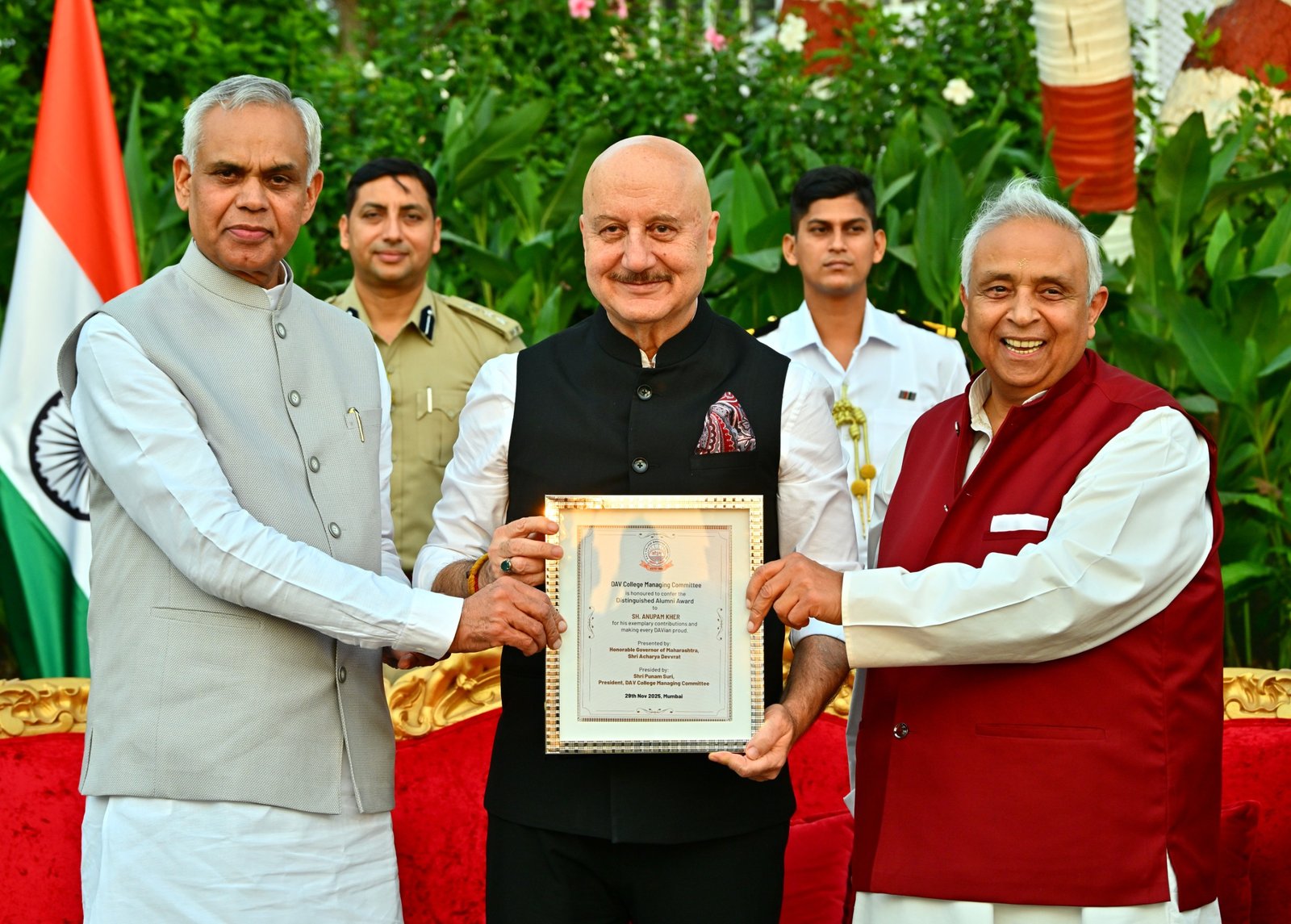 मुंबई – शिमला येथील डीएव्ही पब्लिक स्कूलचे माजी विद्यार्थी असलेले प्रसिद्ध अभिनेते अनुपम खेर यांना शनिवारी राज्यपाल आचार्य देवव्रत यांच्या हस्ते डीएव्ही रत्न पुरस्काराने सन्मानित करण्यात आले.