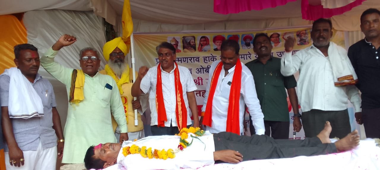 भोकर(प्रतिनिधी)तहसील कार्यालया समोर प्रा . लक्ष्मणराव हाके नवनाथ वाघमारे यांच्या उपोषणाच्या समर्थनार्थ व ओबीसी आरक्षण बचाव या मागणीसाठी संजय गौड ( आलेवार ) यांचे भोकर तहसील कार्यालया समोर प्रतिकात्मक चितेवर (सरणावर )आमरण उपोषण दि.२० जुन रोज गुरुवारी ११ वाजता पासून सुरु आहे.