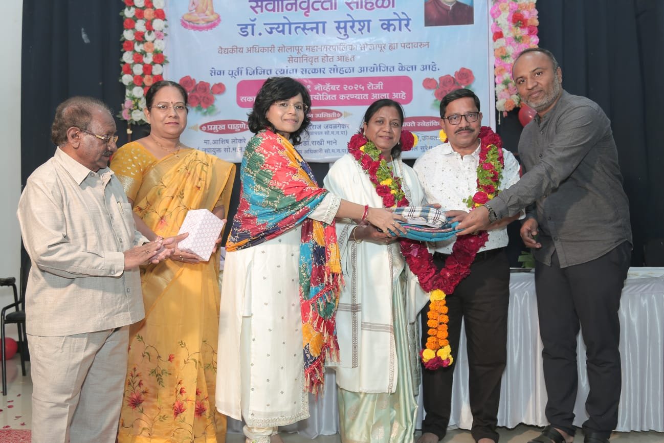 यावेळी आरोग्य अधिकारी डॉ. राखी माने म्हणाल्या, सोलापूर महापालिकेचा आरोग्य विभाग तसेच महापालिकेच्या विविध दवाखाना आणि प्रसूतीगृहात चांगल्या सुविधा देण्यात येत आहेत. चांगले डॉक्टर्स आणि नर्सिंग स्टाफमुळे चांगले उपचार केले जात आहेत. डॉ. ज्योत्स्ना कोरे यांनी आपल्या सेवा काळात जबाबदारी आणि तळमळीने चांगली वैद्यकीय सेवा बजावली आहे. यावेळी डॉ. हराळकर, राजाभाऊ इंगळे, डॉ. मृणाल खंदारे, डॉ. वैशाली शिरशेट्टी, भारतीय बौद्ध महासभेचे जिल्हाध्यक्ष अण्णासाहेब वाघमारे, इकबाल तडकल यांच्यासह मान्यवरांनी डॉ. कोरे यांच्या कार्याचा गुणगौरव करत पुढील वाटचालीस शुभेच्छा दिल्या.