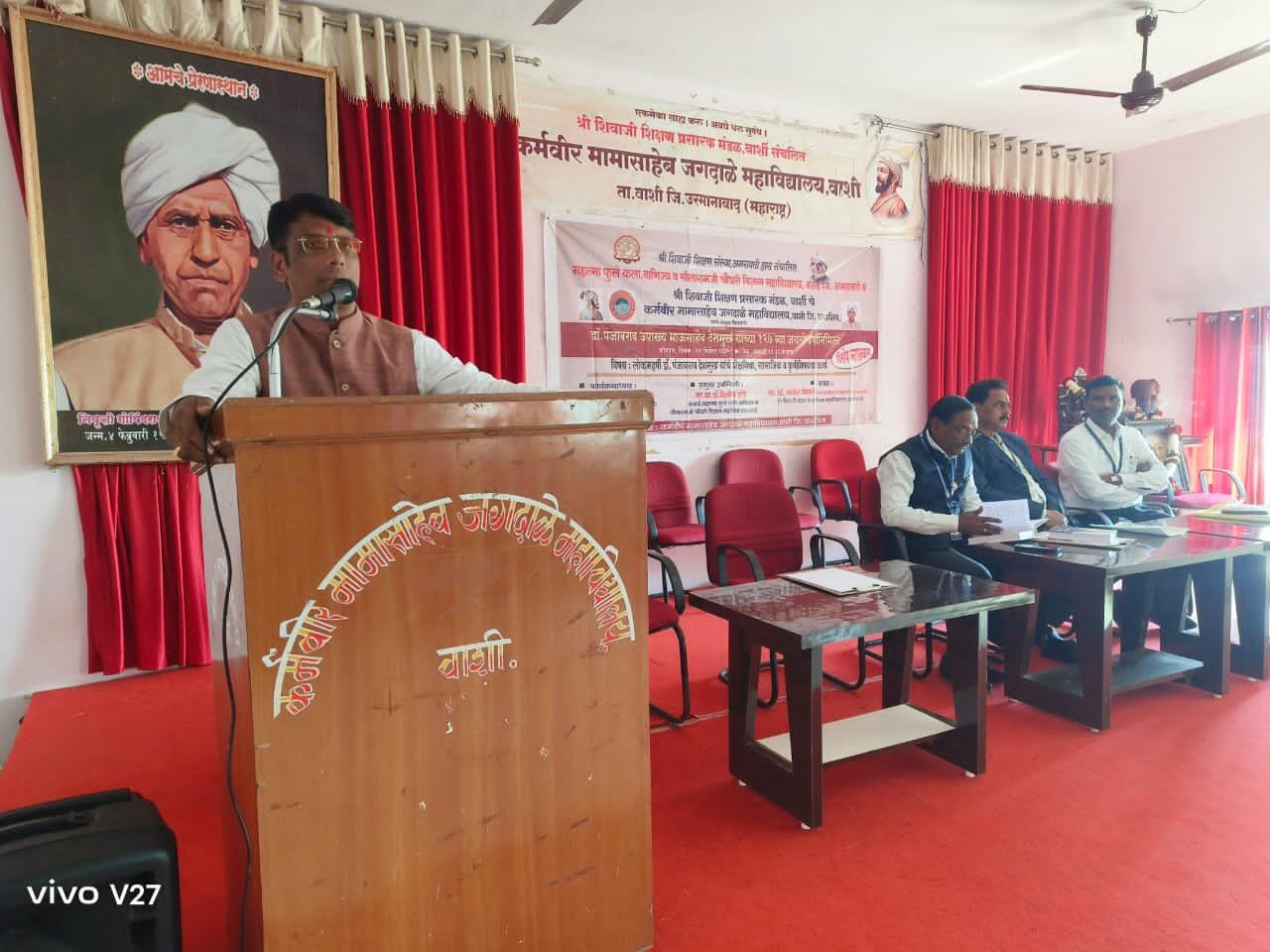 धाराशिव – कर्मवीर मामासाहेब जगदाळे महाविद्यालय वाशी येथे महात्मा फुले कला, वाणिज्य आणि सितारामजी चौधरी विज्ञान महाविद्यालय वरूड जिल्हा अमरावती व कर्मवीर मामासाहेब जगदाळे महाविद्यालय वाशी यांच्या संयुक्त विद्यमाने डॉ. पंजाबराव उपाख्य भाऊसाहेब देशमुख यांच्या 127 व्या जयंतीनिमित्त विशेष व्याख्यानाचे आयोजन करण्यात आले. यावेळी प्रमुख पाहुणे म्हणून मा. प्राचार्य डॉ. दिलीप हांडे, प्रमुख वक्ते मा. डॉ. राजेश मिरगे, मा. प्रा. डॉ. च त्रभुज कदम , कार्यक्रमाचे अध्यक्ष आणि महाविद्यालयाचे प्राचार्य डॉ. अशोक कदम आणि सांस्कृतिक विभागाचे प्रमुख प्रा. डॉ. आनंद करडे उपस्थित होते.
