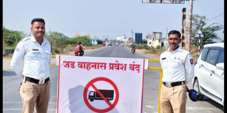 शहरात अवजड वाहने येवू नयेत यासाठी पंढरपूर रोडवर नो एन्ट्रीचे फलक लावल्याचे छायाचित्रात दिसत आहेत. (छाया-प्रथमेश राजे नागणे