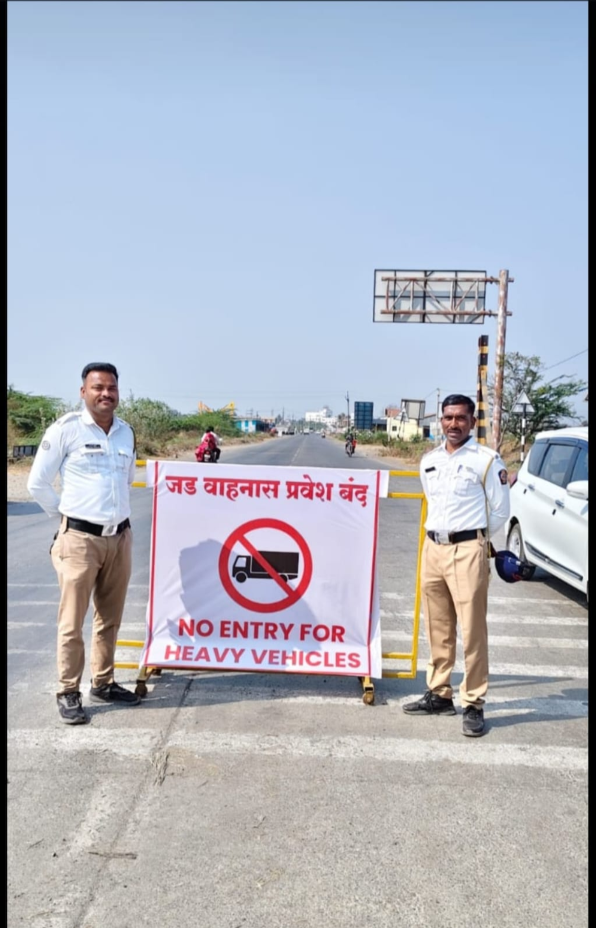 शहरात अवजड वाहने येवू नयेत यासाठी पंढरपूर रोडवर नो एन्ट्रीचे फलक लावल्याचे छायाचित्रात दिसत आहेत. (छाया-प्रथमेश राजे नागणे