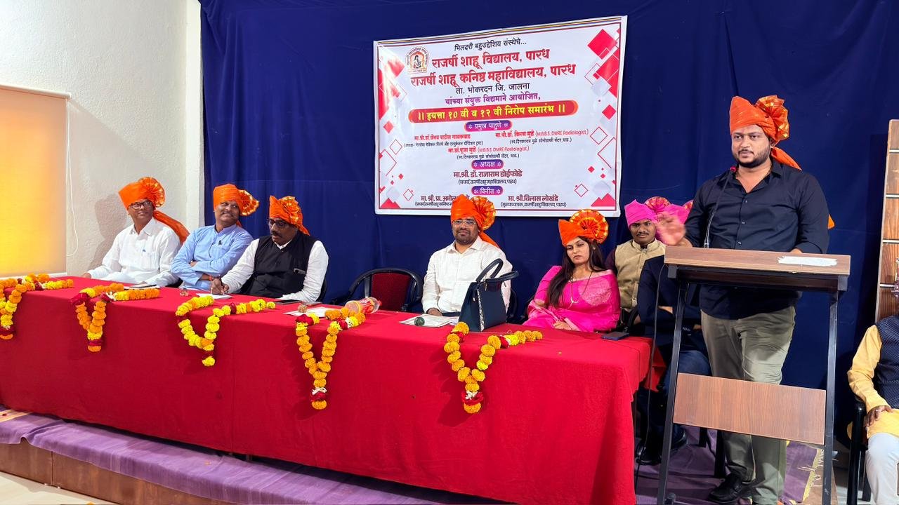 पारध – येथील राजर्षी शाहू शैक्षणिक संकुलनामध्ये वर्ग 10 वी व 12 वी वर्गाचा निरोप समारंभ कार्यक्रम आयोजित करण्यात आला होता, या प्रसंगी महाविद्यालयाचे प्राचार्य डॉ. राजाराम डोईफोडे अध्यक्ष स्थानी उपस्थितीत होते.तसेच प्रमुख पाहुणे म्हणून मा. श्री डॉ. वैभव पाटील गायकवाड अध्यक्ष नेत्रसेवा मेडिकल रिसर्च & एज्युकेशन चॅरिटेबल ट्रस्ट भोकरदन उपस्थित होते, त्यांनी कमवा व शिका असा मोलाचा संदेश या प्रसंगी विध्यार्थ्यांना दिला.