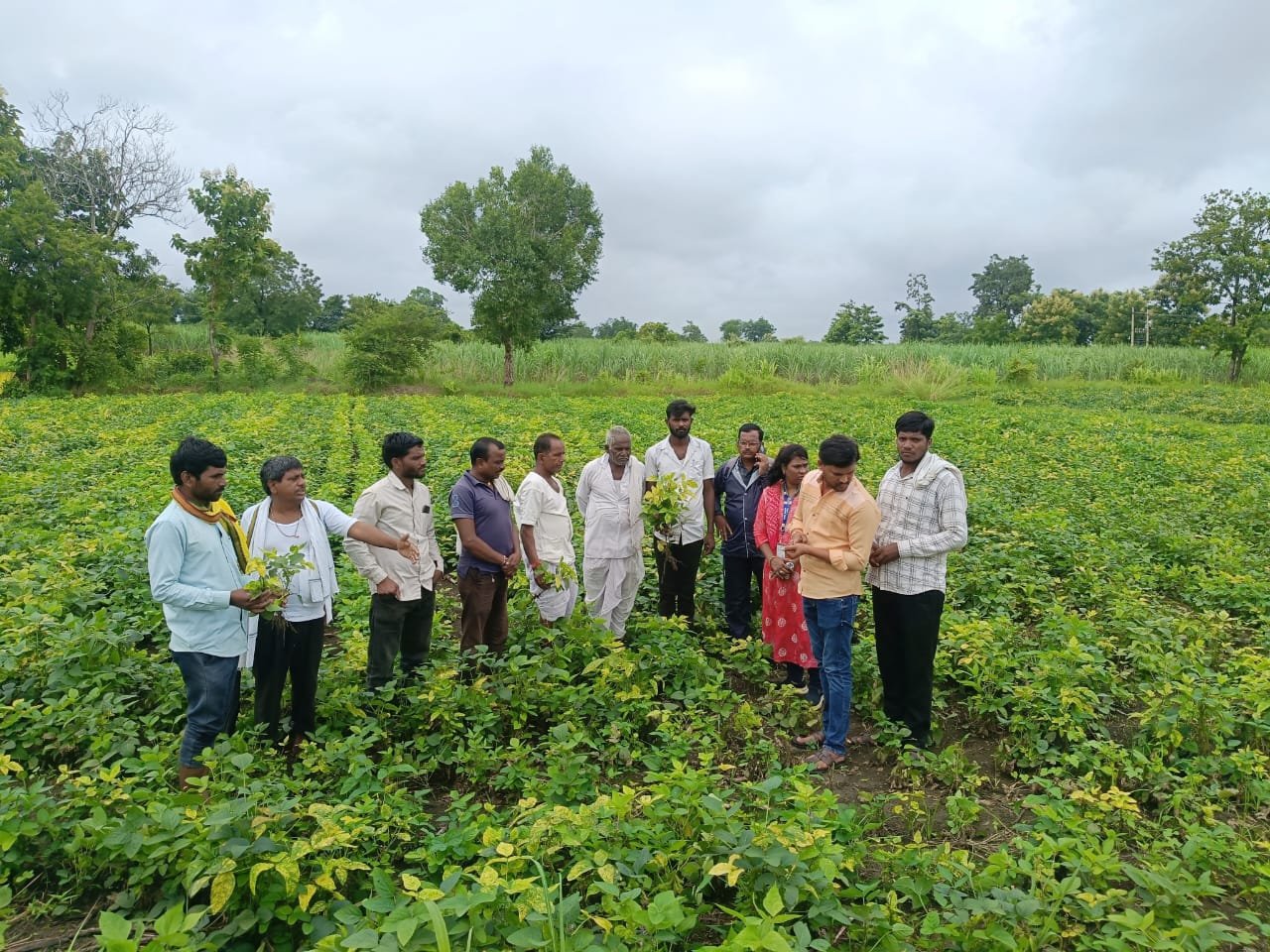 तसेच सोयाबीन वरिल पिवळा मोझॅक व्यवस्थापना विषयी शेतकऱ्यांना मार्गदर्शन केले पिवळा मोझॅक हा विषाण जन्य असून तो पांढरी माशीद्वारे उदभवतो अशी माहिती दिली व पांढऱ्या माशीच्या व्यवस्थापनासाठी एकरी १० पिवळा चिकट सापळा व थायमिथोक्साम १२.६% + लॅम्बडा सिहॅलोथ्रीन ९.६% झेडसी ५० पिली किंवा असिटामिप्रीड २५% + बाइ फेन्थ्रीन २५% wg 1oogm किंवा बीटा साइफलुथ्रीन ८.४९% + इमिडाक्लोप्रीड ११९.८१% ओडी hom l यापैकी एका किटकनाशकाची फवारणी प्रति एकर समस्याणात करावी असे मार्गदर्शन केले.
