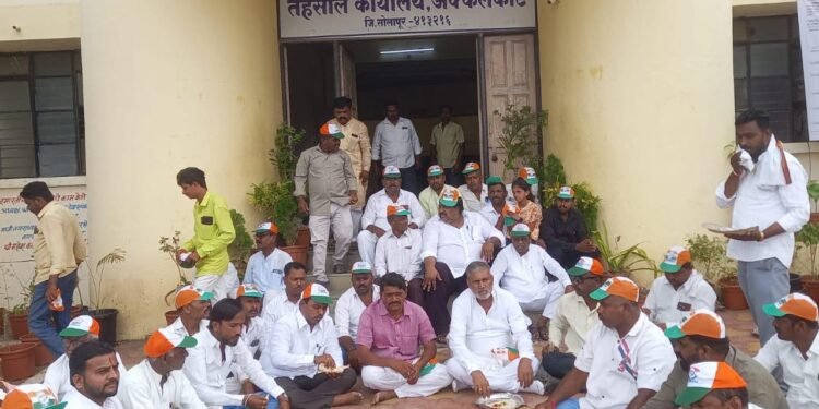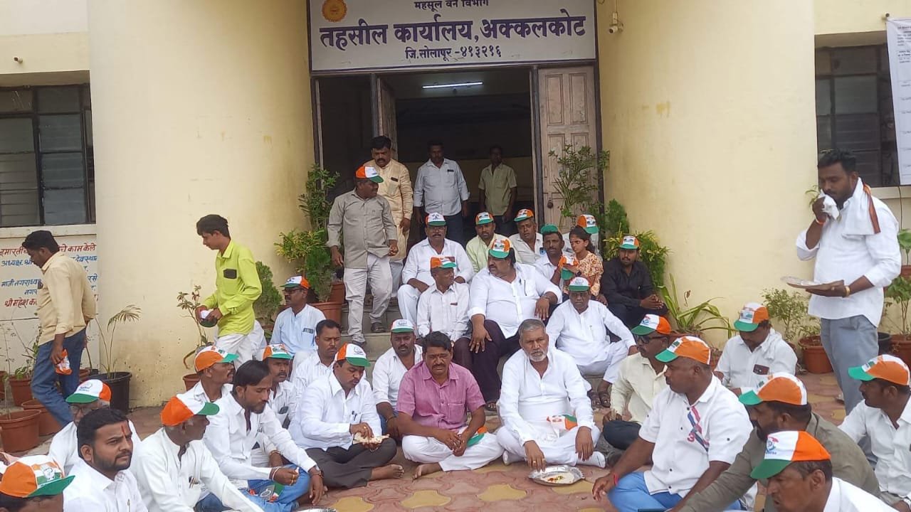 अक्कलकोट – दिवाळी संपत आले असतानाही शेतकऱ्यांच्या खात्यामध्ये अतिवृष्टी नुकसानीचे पैसे जमा नाही झाल्याने काँग्रेस तालुकाध्यक्ष मल्लिकार्जुन पाटील यांच्या नेतृत्वाखाली शेतकरी बांधव तहसील कार्यालय समोर खर्डा भाकरी पिठलं चटणी खाऊन काळी दिवाळी साजरी केली.