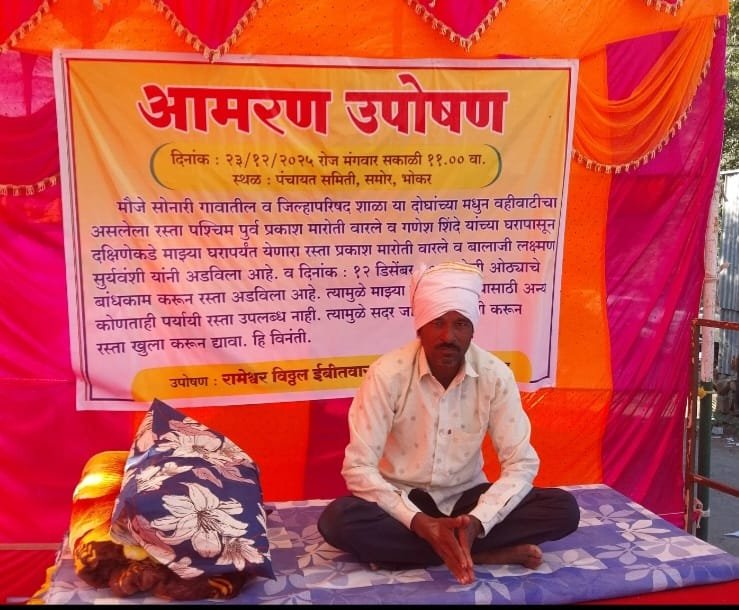 भोकर / नांदेड – तालूक्यातील मौजे सोनारी येथील शेतकरी रामेश्वर ईबीतवार यांच्या शेती व घराकडे जाणा-या सार्वजनीक रस्त्यावर बांधकाम करून अडथळा निर्माण केला. याबाबत गावातील तंटामुक्ती समितीने बैठक घेतली आणि प्रशासनाकडे सूध्दा तक्रार दिली पण काही तोडगा काढला नसल्याने रस्त्यासाठी रामेश्वर ईबितवार यांनी दि.२३ पासून पंचायत समिती समोर बेमुदत उपोषण सूरु केले आहे.