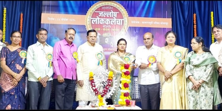 सोलापूर – जिल्ह्यातील बालकलाकारांमध्ये लोककलेचा प्रसार व्हावा या उदात्त हेतूने बालरंगभूमी परिषदेतर्फे एकदिवसीय “जल्लोष लोककलेचा” हा भव्य लोककला महोत्सव उत्साहात साजरा करण्यात आला. ६ ते १५ वयोगटातील बालकलाकारांना त्यांच्या कलागुणांचे प्रदर्शन करण्यासाठी हे हक्काचे व्यासपीठ मिळाले. हरिभाई देवकरण प्रशालेच्या मुळे सभागृहात दीपप्रज्वलन आणि नटराजाच्या मूर्तीचे पूजन करून उद्घाटन करण्यात आले
