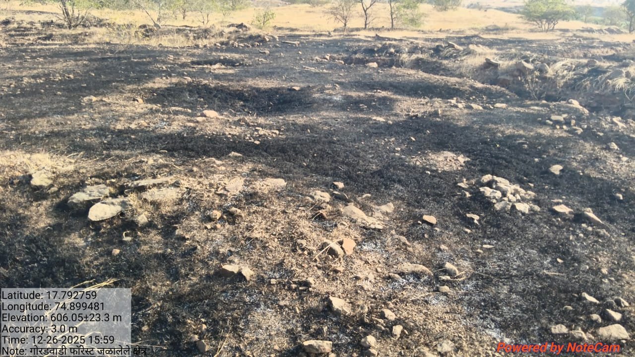 निवेदनात पुढे म्हटले आहे की , मौजे गोरडवाडी राखीव गट ४६८ नं.-या प्रमाणे अक्षांश १७.७९१२४ रेखांश ७४.७९८३ दि.२६/१२/२०२५ वेळ १६.०५ मी या घटनास्थळी फॉरेस्ट गार्डच्या गलथान कारभारामुळे (हलगर्जीपणामुळे) फॉरेस्ट क्षेत्राला आग लागली आहे. हकीगत अशी की वनविभागामध्ये राखीव फॉरेस्ट क्षेत्रामध्ये गवताचे प्रमाण या हंगामामध्ये भरपुर गवत वाढलेले व वाळलेले असते या फॉरेस्ट क्षेत्रालगत व आतील रस्त्यालगत नोव्हेबर व डिसेंबर महिन्यात जाळरेषा फॉरेस्ट खात्यामार्फत रोजगार लोक लाऊन जिल्हा हद्द व जिल्हाअंतर्गत फॉरेस्ट क्षेत्राच्या आतील व बाहेरील बाजूस जाळ रेषा काढणे गरजेचे असते. जाळरेषा काढणेसाठी गावातील मजुर लाऊन रात्रीच्या वेळेला जाळरेषा काढणे गरजेचे असते. ते कृतीत (जागेवर) न लावता कागदावरच कागदी घोडे नाचवून जवळचे नातेवाईक फॉरेस्ट गार्डच्या हीतसंबंध व रोजंदारी वॉचमन यांच्या नातेवाईकांच्या नावावर ३२ नंबर भरुन बिले तयार करुन पैसे काढून घेऊन हे अधिकारी संगणमताने करतात व जागेवर जाळरेषेचे काम जे फॉरेस्ट क्षेत्रामध्ये रोजंदारी मजूर