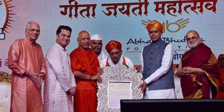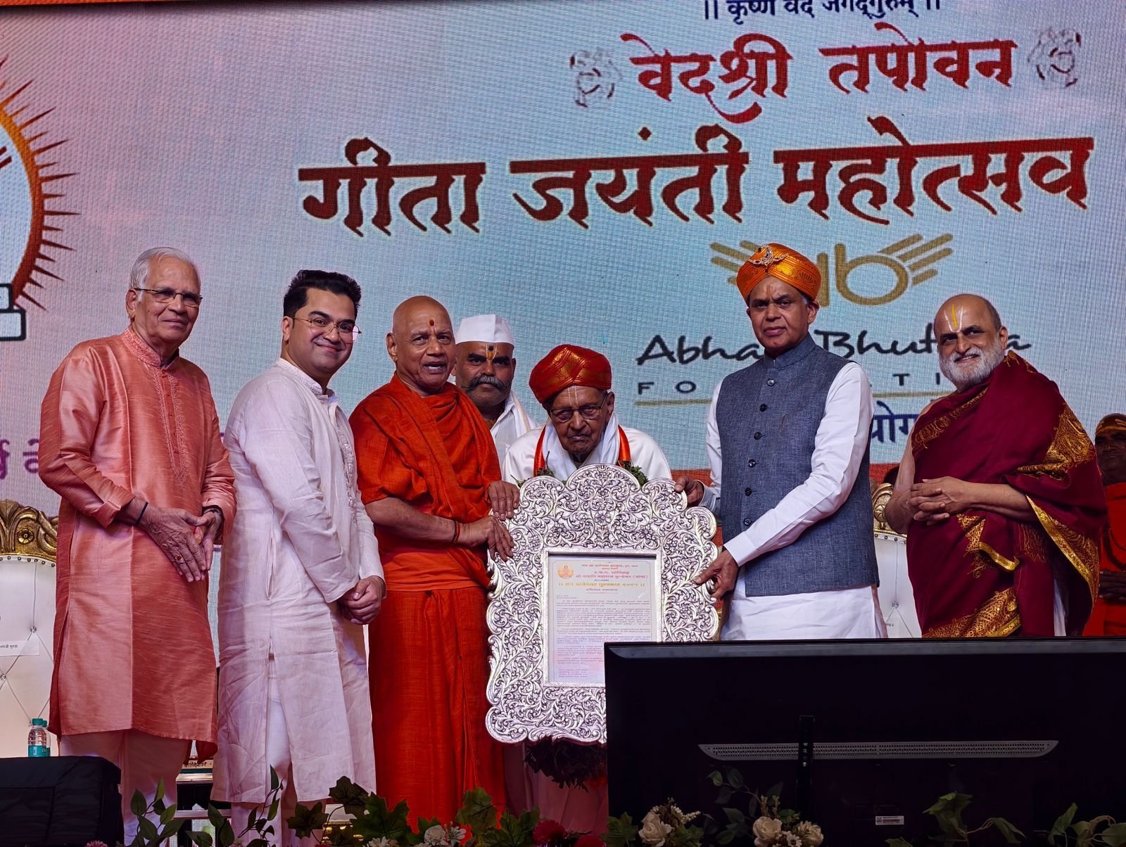 सोलापूर – वेदश्री तपोवन, महर्षी वेदव्यास प्रतिष्ठान, व इत्यादी संस्थांच्या सहयोगाने वेदश्री तपोवन, आळंदी येथे आयोजित गीता जयंती महोत्सवाचा तीन दिवसाचा कार्यक्रम माननीय राज्यपाल आचार्य देवव्रत यांच्या उपस्थितित संपन्न झाला.याप्रसंगी पुण्याचे प्रसिद्ध उद्योगपती,महर्षी वेदव्यास प्रतिष्ठानचे ट्रस्टी व महोत्सवाचे प्रायोजक श्री अभय भुतडा, श्री राम जन्मभूमी न्यास, अयोध्या येथील कोषाध्यक्ष स्वामी गोविंद देव गिरी महाराज, गीता धर्म मंडळाचे अध्यक्ष मुकुंद दातार व संजय मालपाणी हे व्यासपीठावर उपस्थित होते.अंतिम दिनी महाराष्ट्राचे राज्यपाल आचार्य देवव्रत यांनी ह.भ.प. शांतीब्रह्म श्री मारुती बाबा कुरहेकर यांना संत श्री ज्ञानेश्वर पुरस्कार व सी.एस.रंगराजन यांना स्वामी विवेकानंद पुरस्कार प्रदान केला.कार्यक्रमाच्या आरंभी अभय भुतडा यांनी राज्यपालांचे गणेश मूर्ति देऊन स्वागत केले.