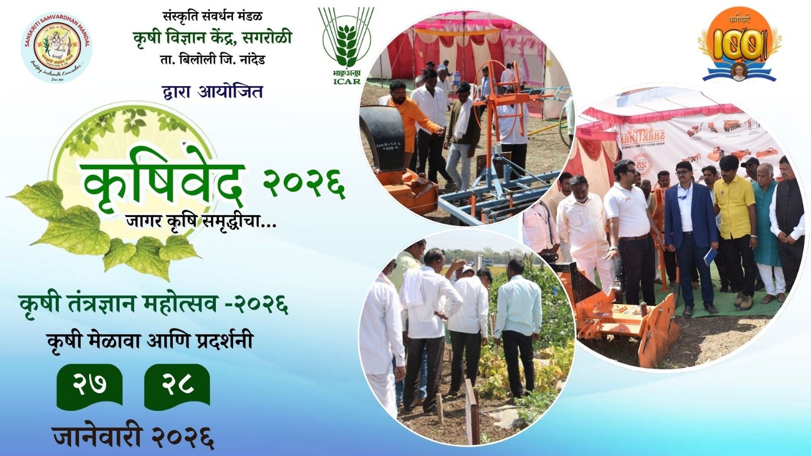 बिलोली – सगरोळी (ता. बिलोली) येथील संस्कृति संवर्धन मंडळाच्या कृषी विज्ञान केंद्रातर्फे मंगळवार (दि. २७) व बुधवार (दि. २८) दरम्यान दोन दिवसीय ‘कृषिवेद २०२६ – कृषी तंत्रज्ञान महोत्सव व कृषी मेळावा’ आयोजित करण्यात आला आहे. या महोत्सवात विविध चर्चासत्रे, मान्यवरांचे मार्गदर्शन, यशोगाथा, प्रयोगशील शेतकऱ्यांचा सन्मान, पशुप्रदर्शन, तसेच शेतीविषयक माहिती व विक्रीसाठी विविध नामांकित कंपन्यांचे स्टॉल्स उपलब्ध असणार आहेत.